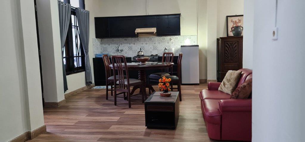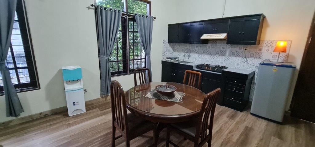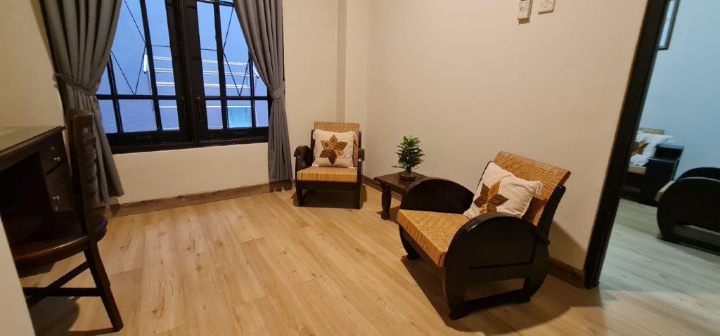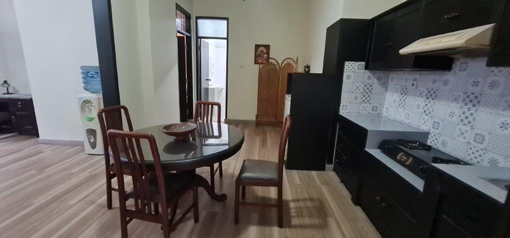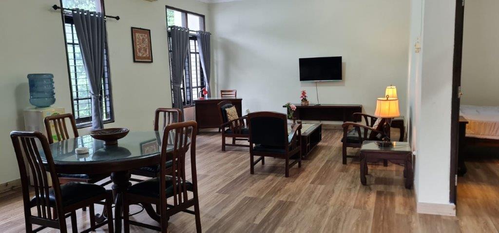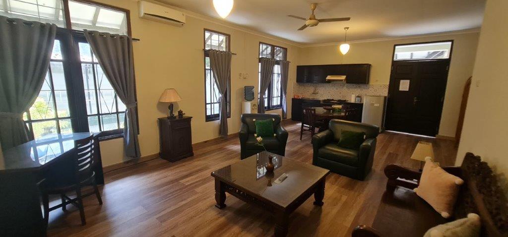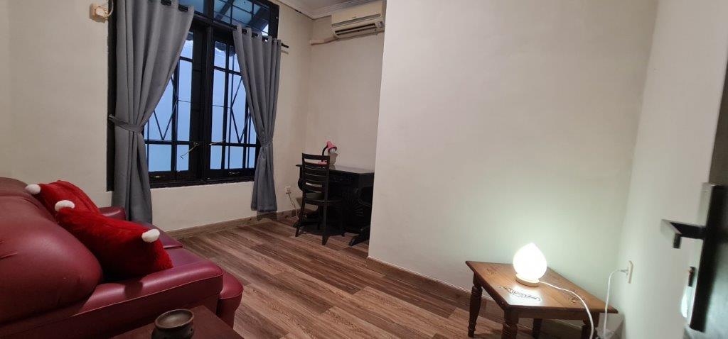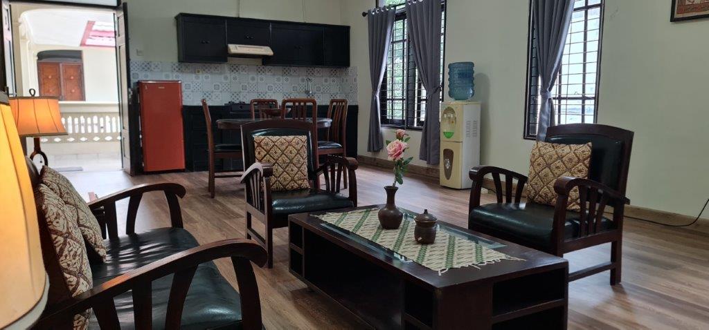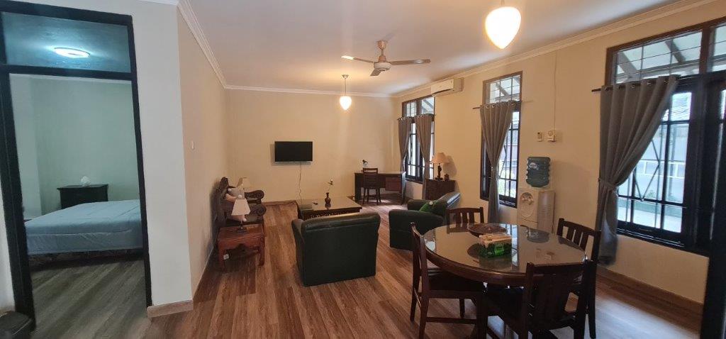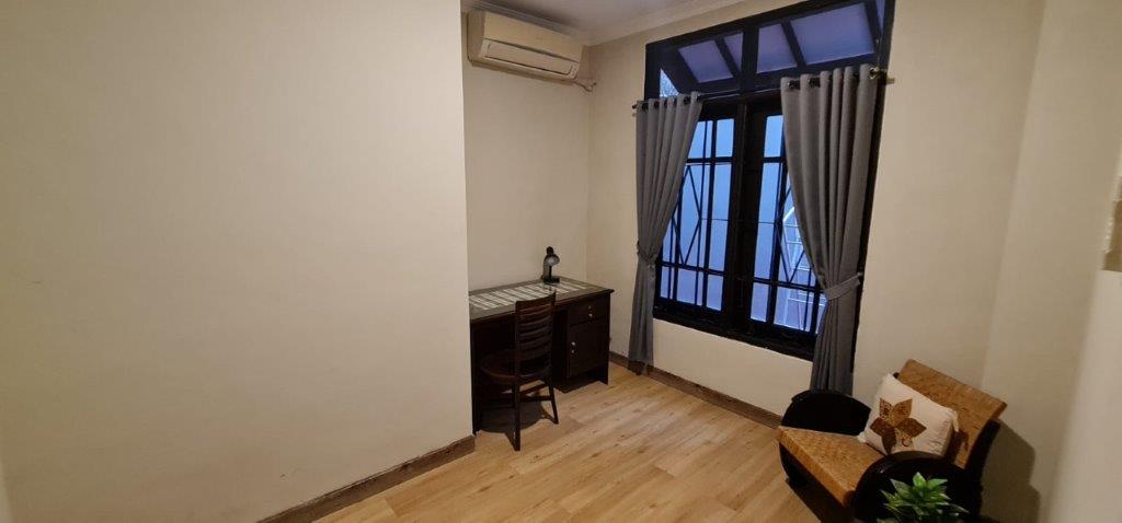 Ruang tamu yang luas dan terbuka sempurna untuk menerima tamu atau mengadakan meeting, menciptakan suasana bekerja yang nyaman dan produktif. Interior dilengkapi dengan sofa dan meja kayu bergaya ethnic, menambah kesan hangat dan elegan. Balkon pribadi yang luas dengan sirkulasi udara yang baik adalah tempat ideal untuk bersantai setelah hari yang sibuk.
