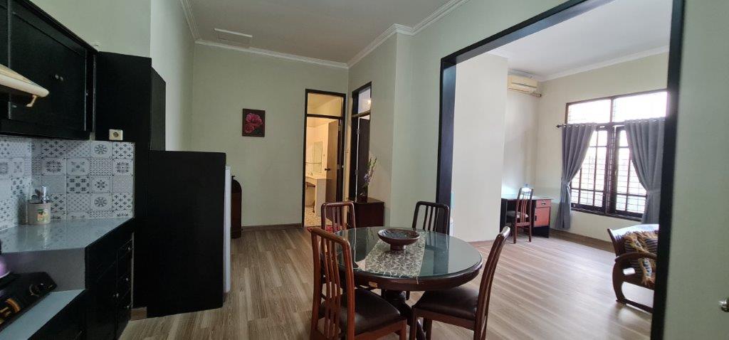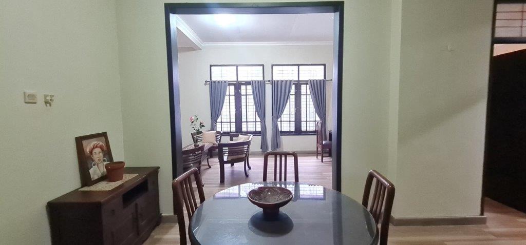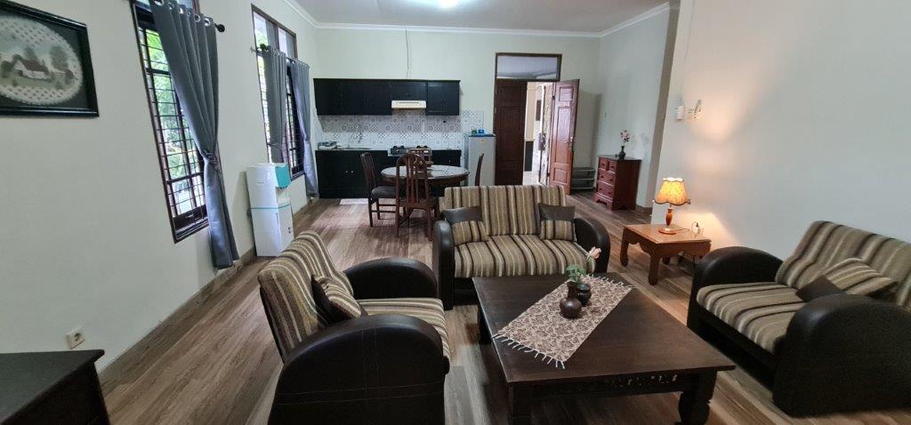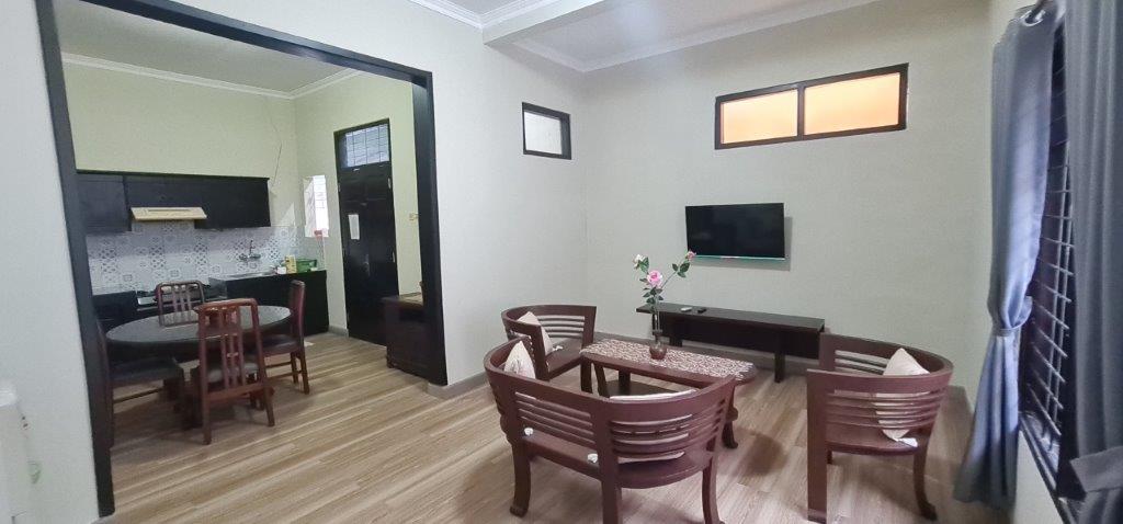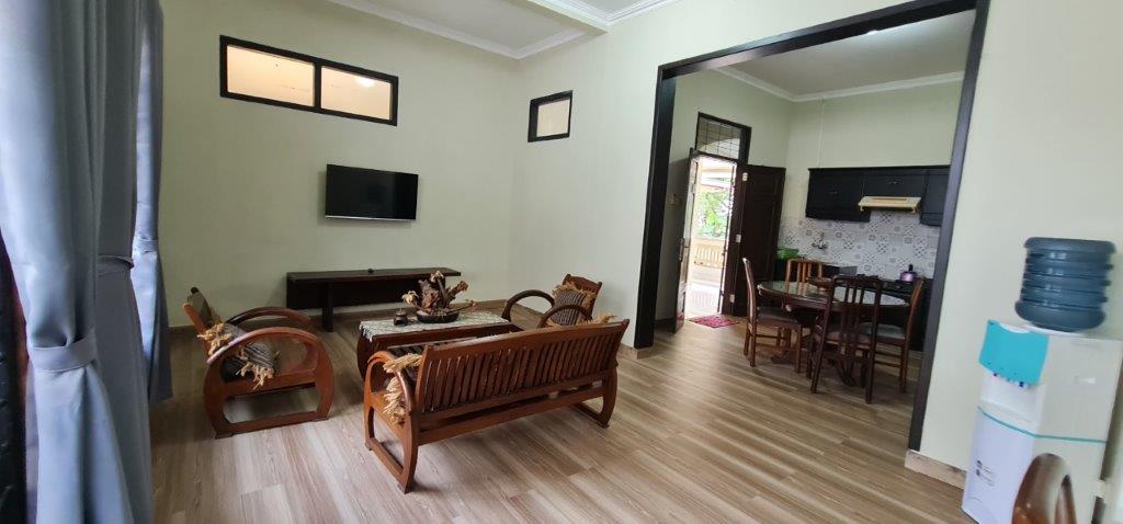 Ruang tamu yang lapang dipisahkan oleh partisi, menciptakan area yang tertata rapi dan terorganisir. Interior yang memadukan kenyamanan modern dengan sentuhan khas Javanese style, menghadirkan suasana elegan. Sirkulasi udara yang baik diperoleh dari jendela dengan jarak antar dinding yang jauh, memastikan aliran udara segar sepanjang hari.