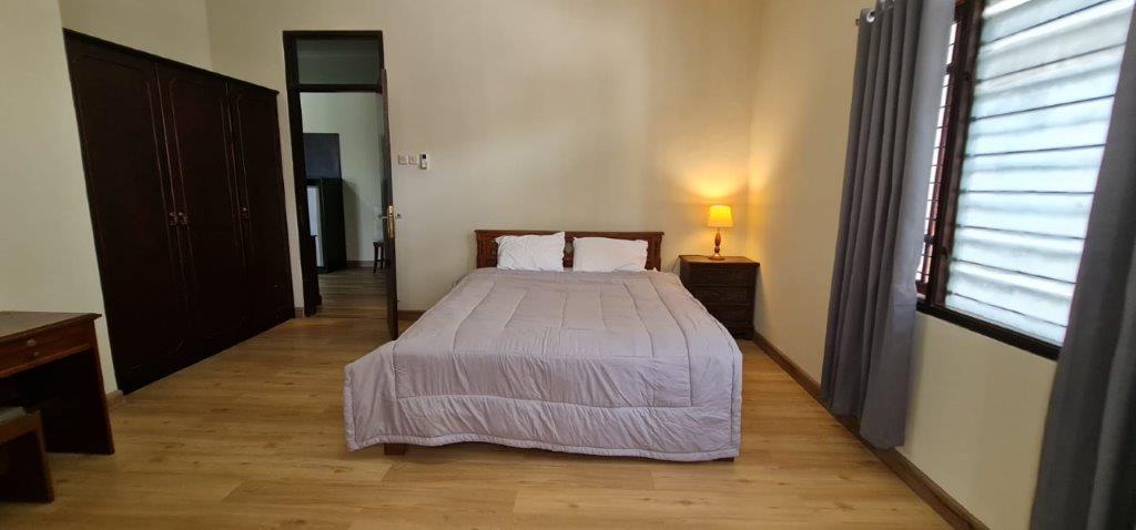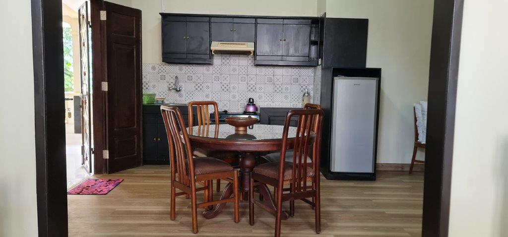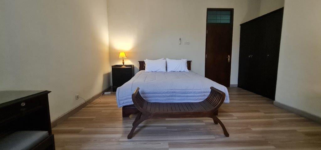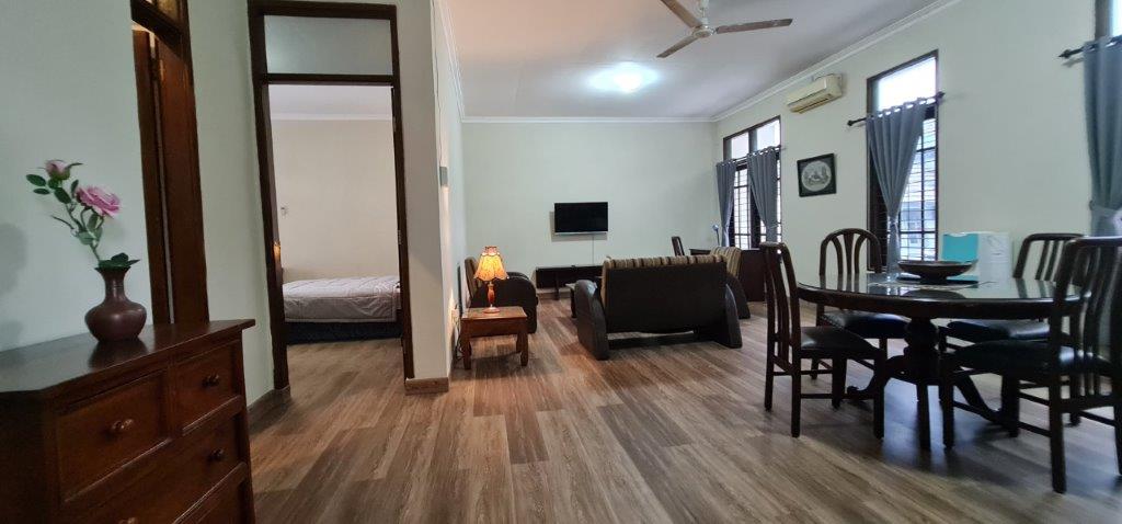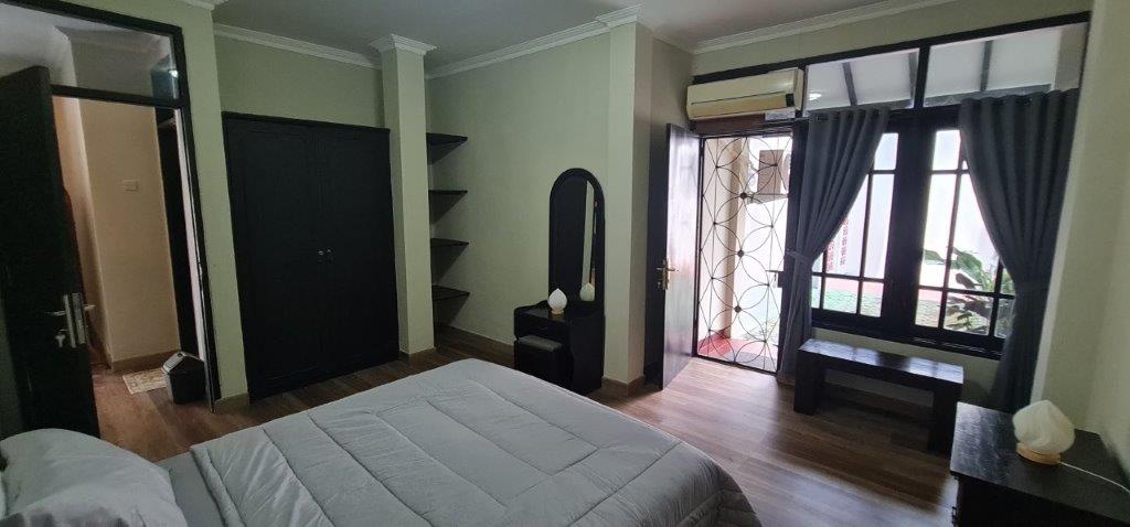 Nikmati udara segar di balkon pribadi yang luas, ideal untuk bersantai atau menjamu tamu. Interior dengan furniture bergaya rumahan ini, menciptakan suasana hangat dan nyaman. Ruang tamunya luas, diisi dengan kursi rotan dan meja kayu, menciptakan kesan ethnic dan modern.